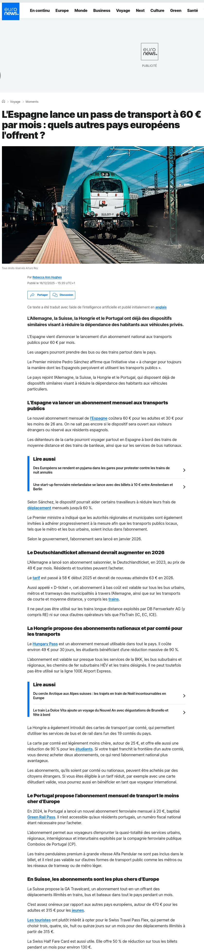 En tous cas regardons avec envie les pays européens qui ont une politique tarifaire favorable au train avec cet article d’Euronews qui fait le point sur les pass transports :