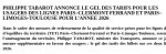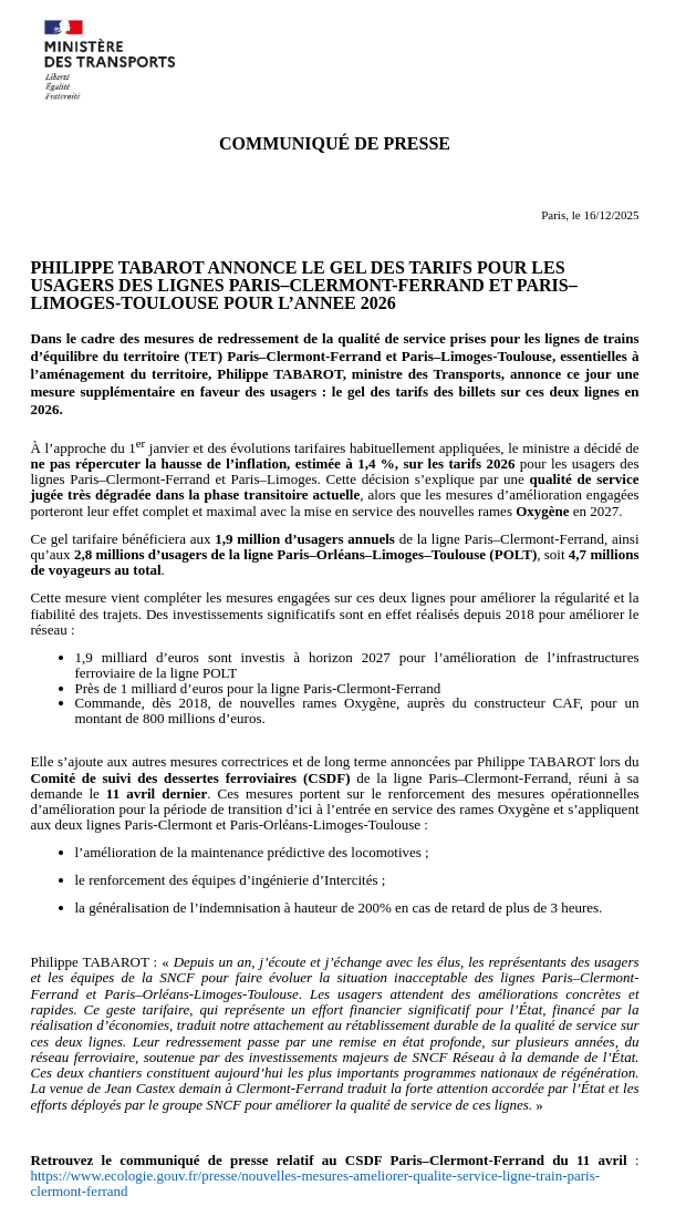 Par un communiqué la veille, hier mardi, le ministre des transports annonce un gel des tarifs sur cette ligne et pour la ligne POLT (Paris Orléans Limoges Toulouse) pour 2026. Un geste demandé et obtenu donc par le Collectif des Usagers de la ligne Clermont Paris :