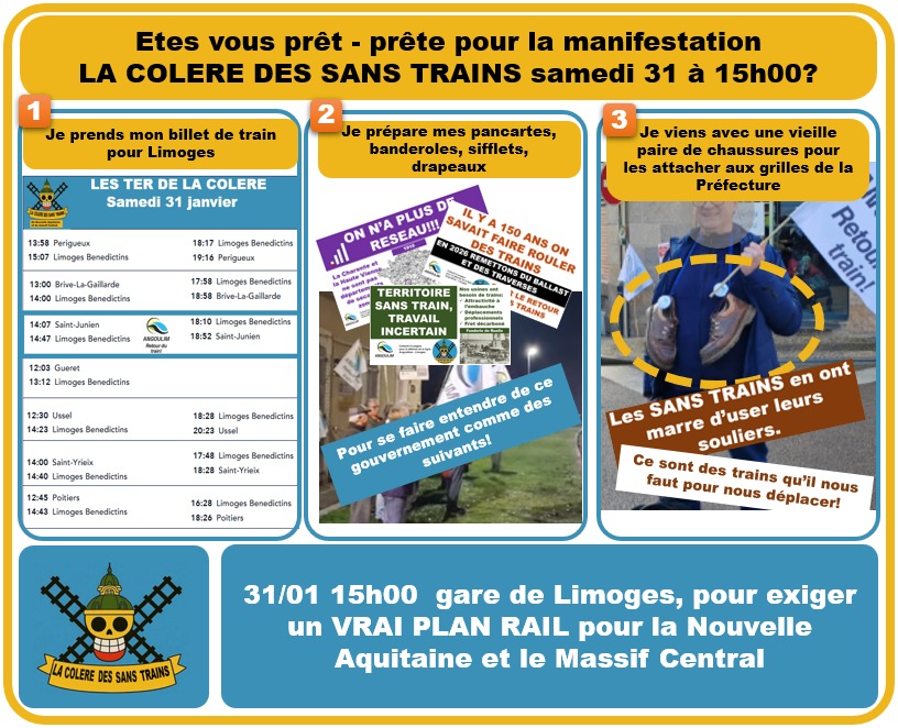 Les SANS TRAINS de Nouvelle Aquitaine, Nord Occitanie et du Massif Central donnent rendez-vous le samedi 31/01 à 15h00 devant la gare de Limoges.