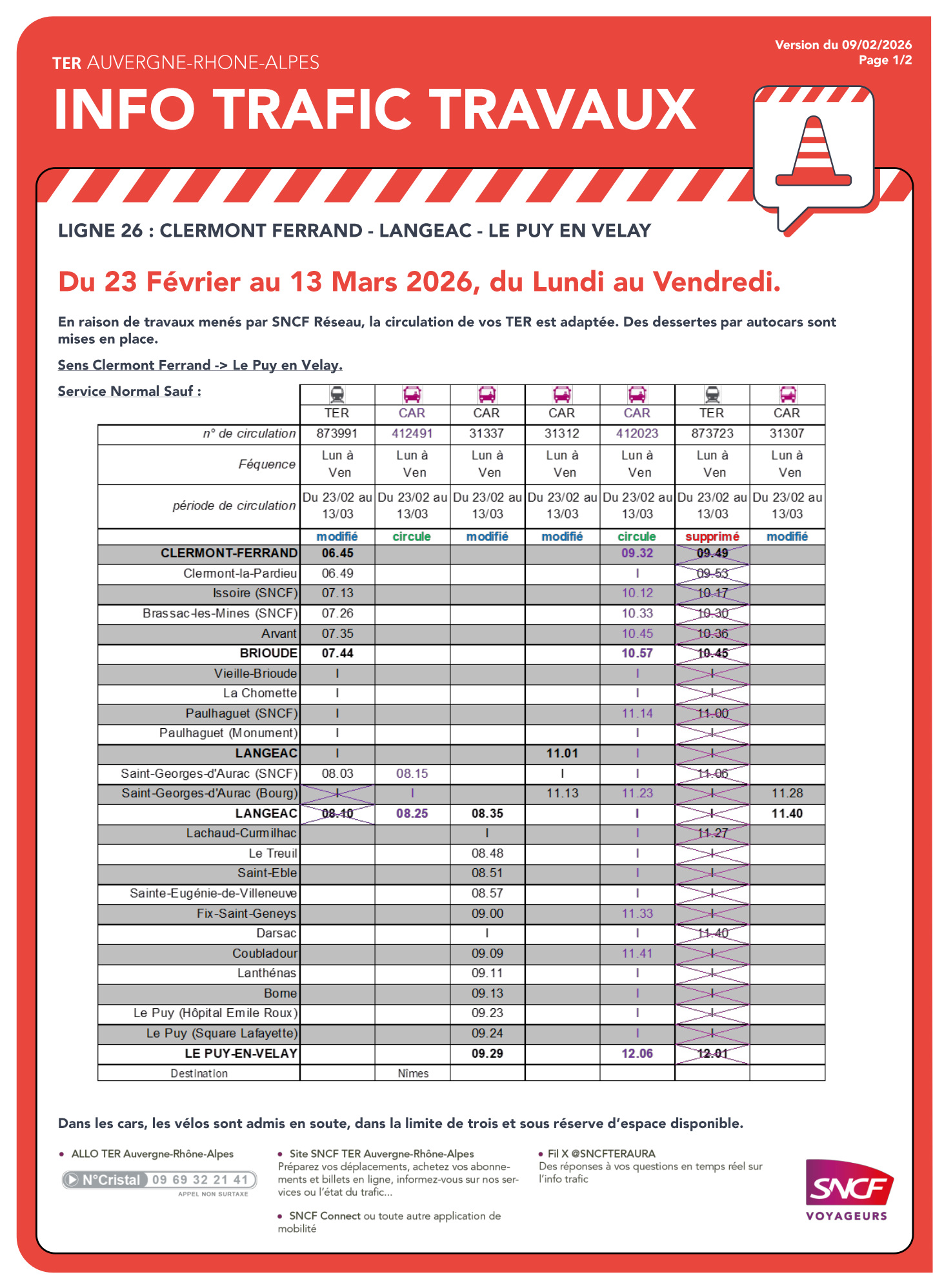 2) Pour la ligne Le Puy en Velay – Clermont suppression de tout trafic entre St Georges et Le Puy du 23/03 au 16/03 :