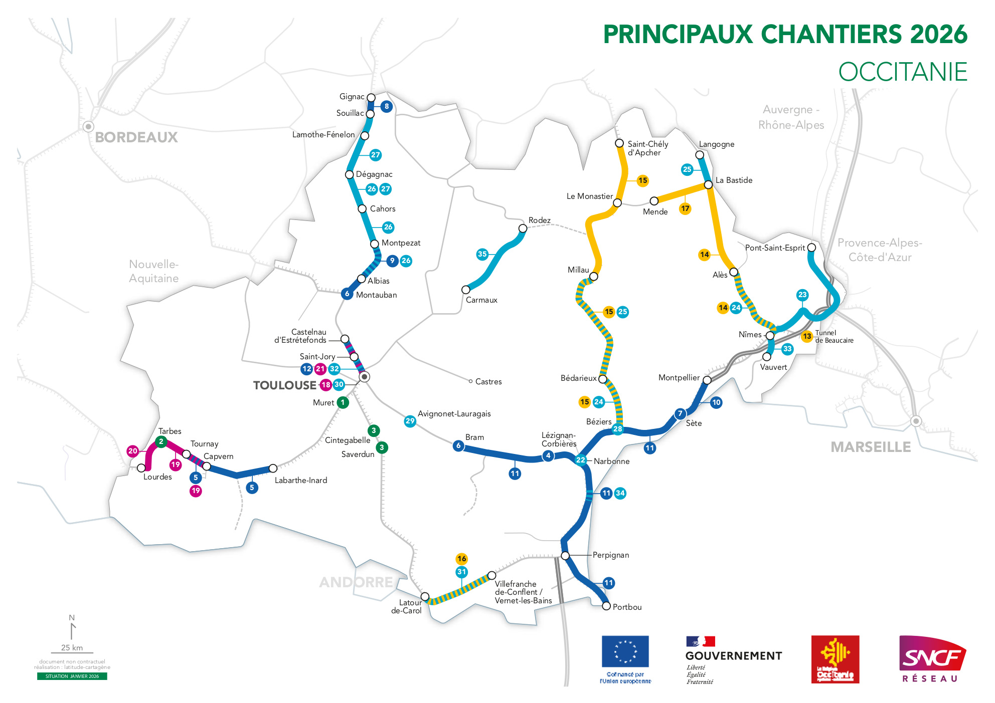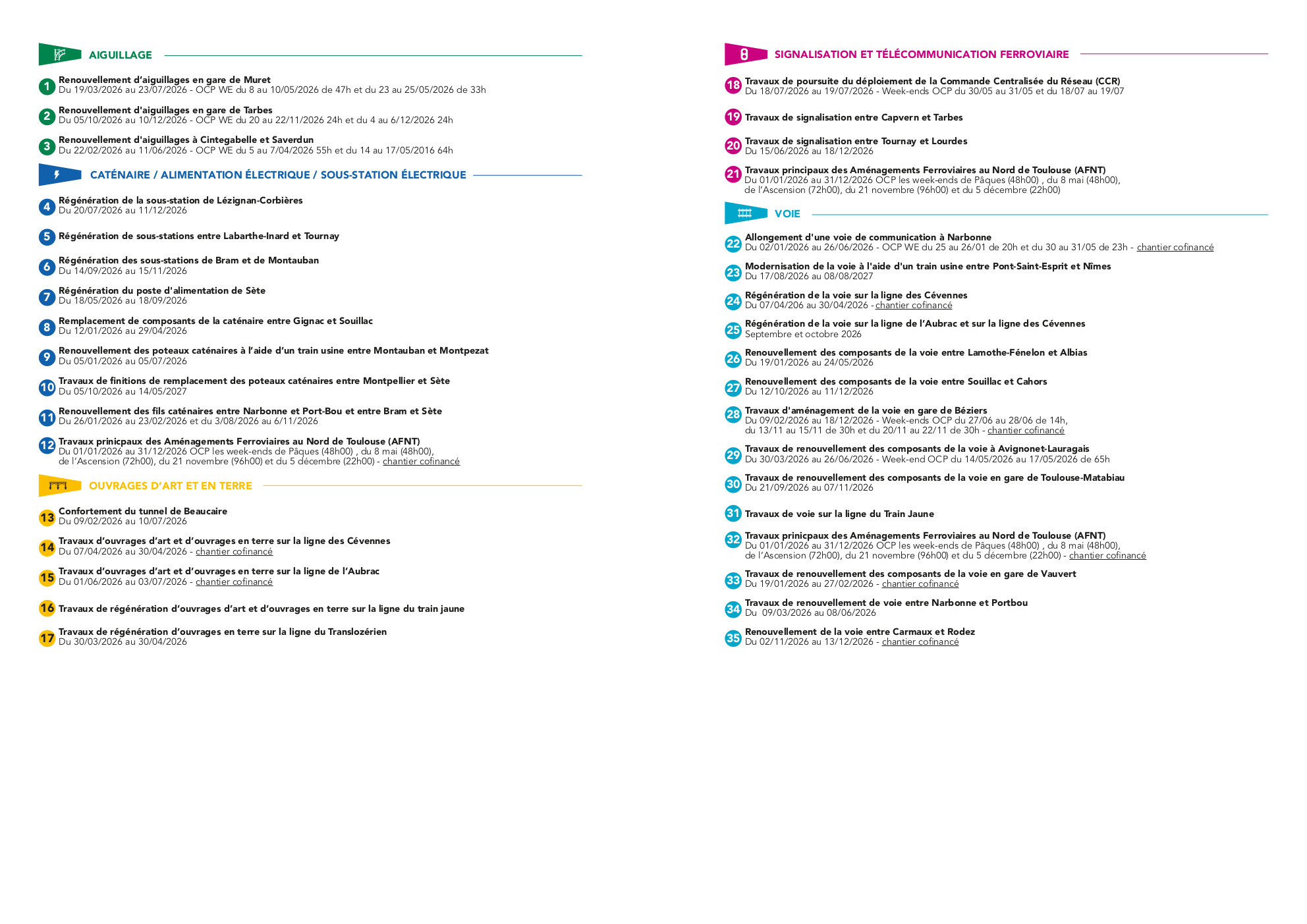 Et si ce n’était que ça ! On serait immensemment ravis de connaître le détail des travaux pour 2026 sur la région AuRA et sur la ligne des Cévennes, alors que ces travaux avec coupure ont débuté ! En effet la carte des chantiers 2026 en Auvergne Rhône Alpes n’a pas été diffusée cette année alors qu’elle l’a été en Occitanie.
