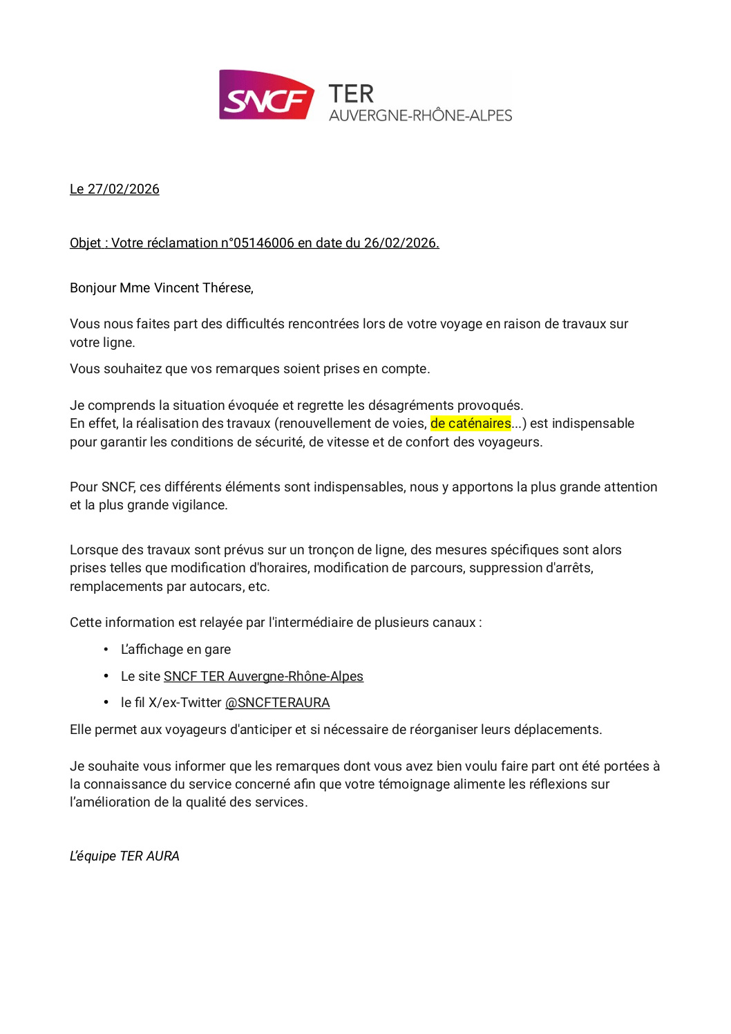 On remarquera la réponse type balancée par la SNCF Auvergne Rhône Alpes qui nous parle de travaux sur des caténaires alors qu’aucune section n’est électrifiée sur la ligne des Cévennes.