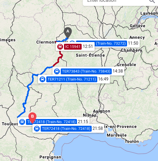 En descendant dans la page on va choisir celui de 11h50 avec 4 changements. On voit que c’est le plus direct possible – ce qui ne veut pas dire le moins cher – sur la carte affichée à droite en direct :
