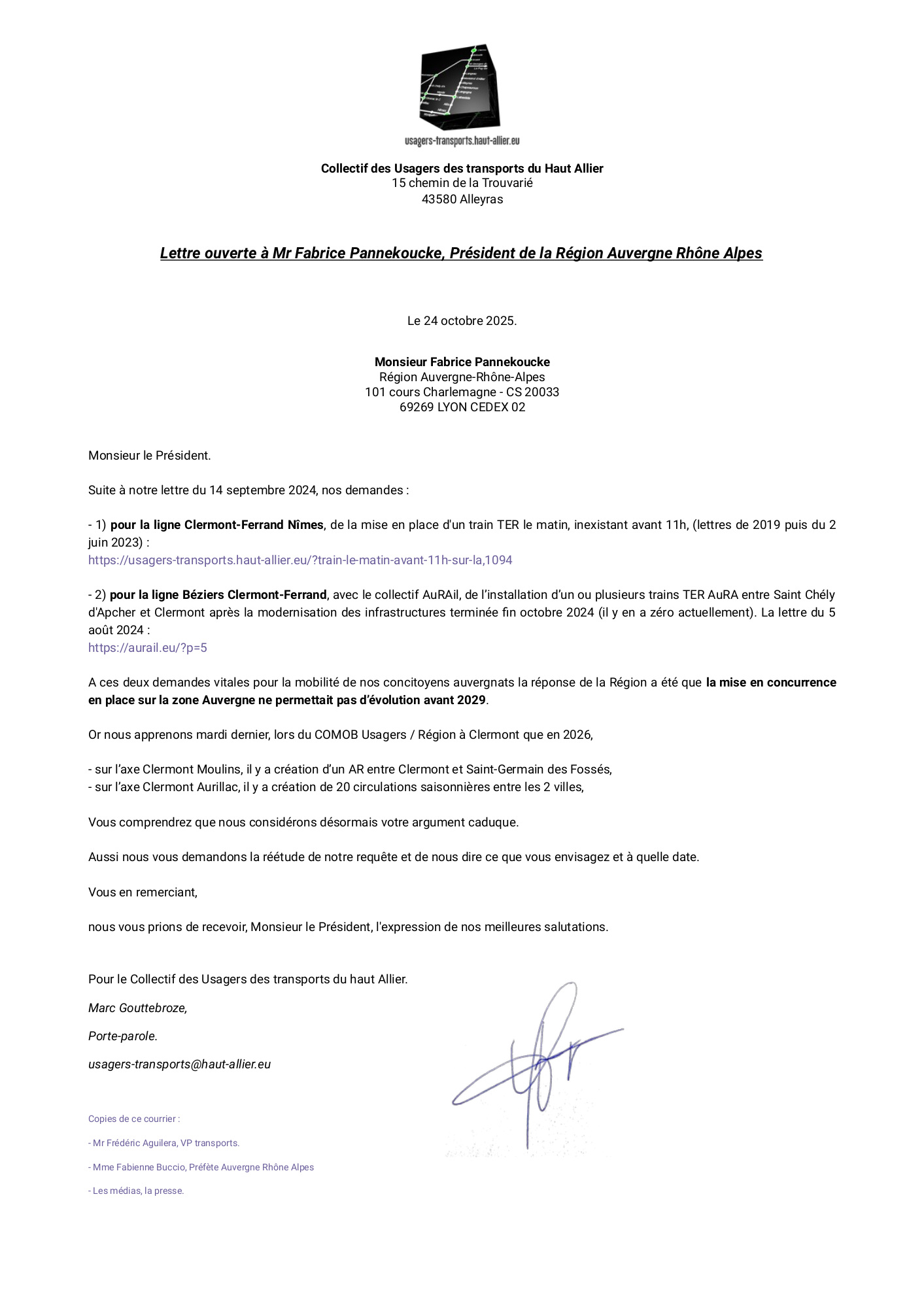 Nous venons d’adresser une lettre à Fabrice Pannekoucke, président de la région AuRA, pour demander la réétude de nos demandes concernant la ligne Nîmes Clermont : un train le matin en correspondance avec le premier Mende – La Bastide, puisqu’aucun train n’existe actuellement avant 10 – 11h, et concernant la ligne des Causses (Aubrac) la mise en place de circulations en trains TER entre Saint-Chély d’Apcher et Neussargues voire Clermont Ferrand, puisqu’elles sont inexistantes à ce jour, alors que la voie vient d’être entièrement renouvellée en octobre 2024 et que seul un train Intercités quotidien y circule.