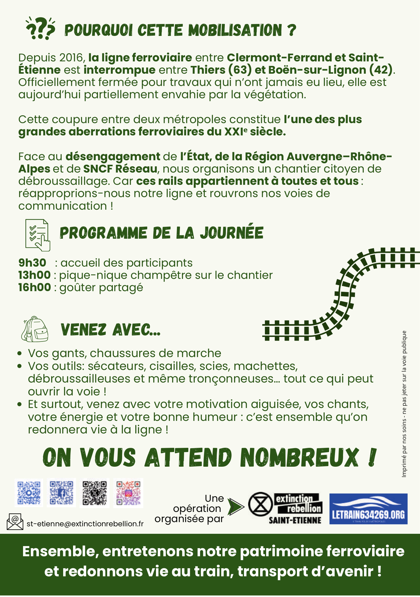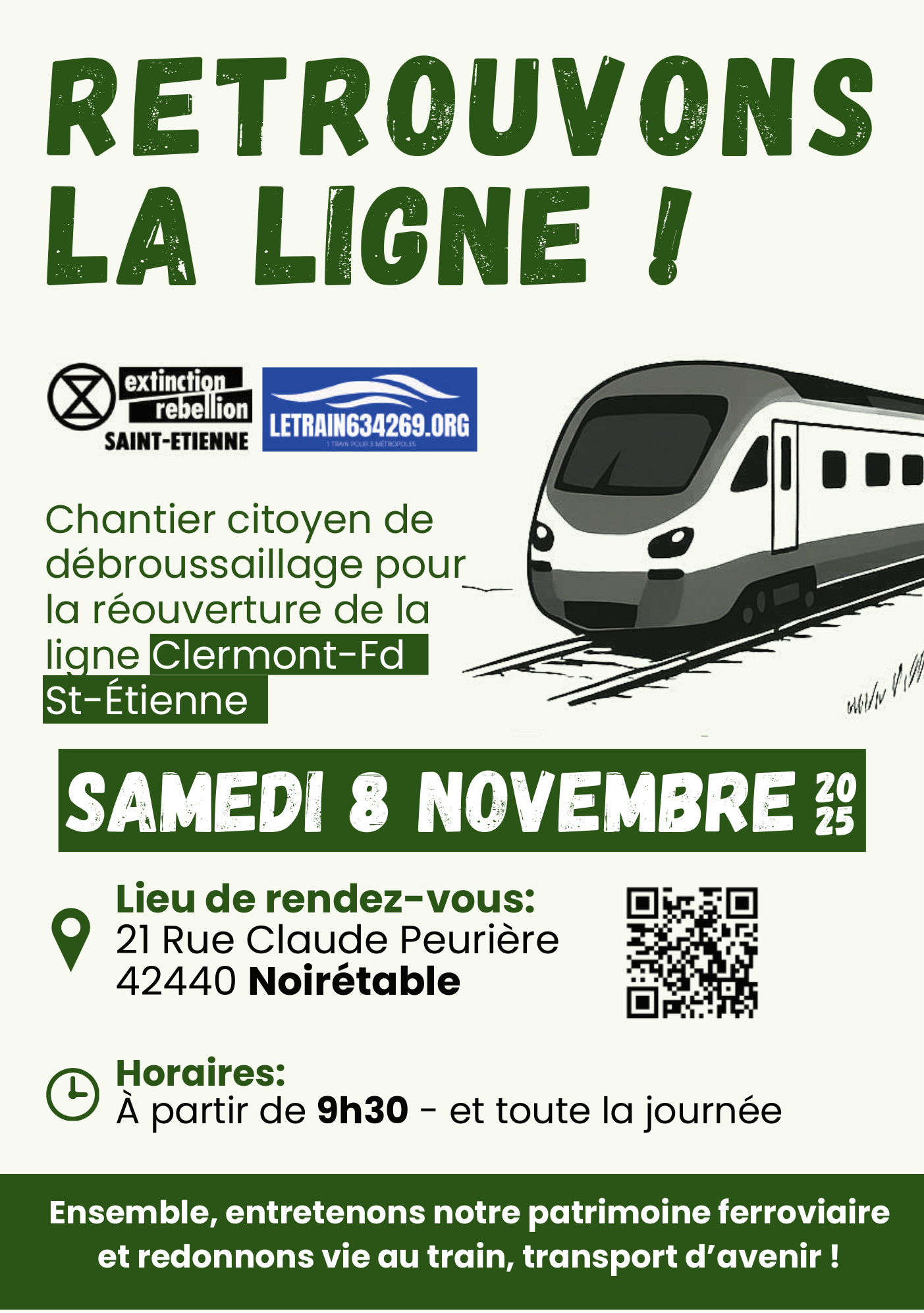 Letrain634269 suggère une grande opération de débroussaillage de la ligne Thiers Boën ce samedi 8 novembre 2025 à partir de 9h30. Le rendez-vous est à Noirétable. Il faut arriver avec ses outils et son gilet fluo. Le programme de la journée en détail :